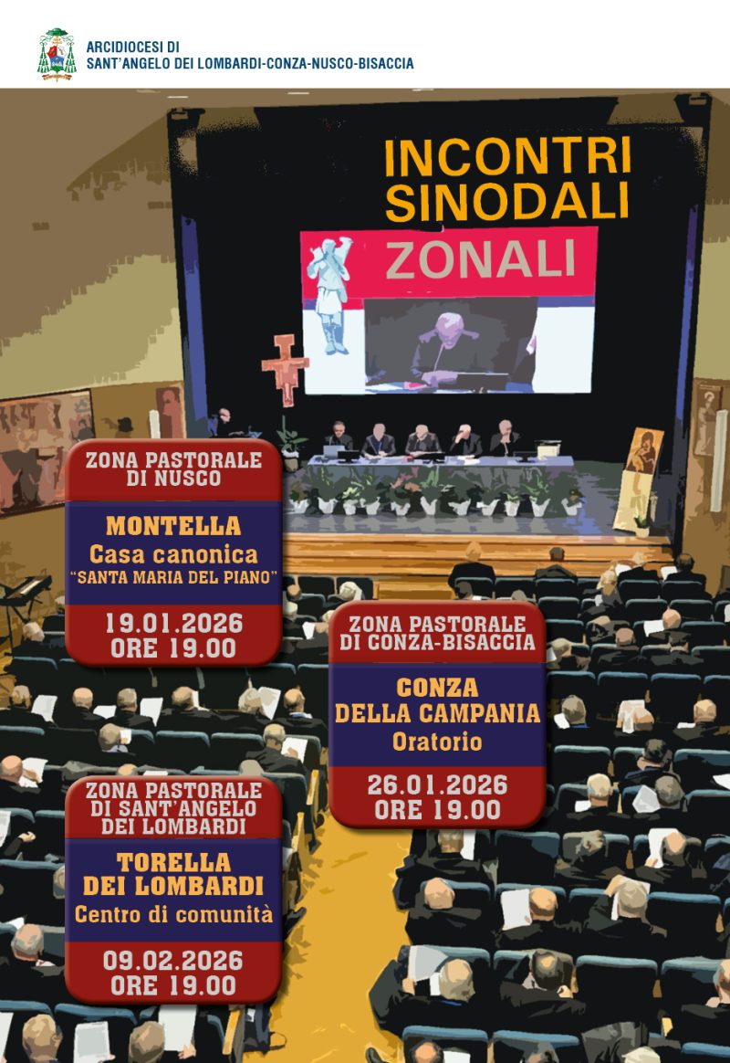desidero invitare tutta la Comunità diocesana agli incontri nelle tre Zone Pastorali di Sant’Angelo dei Lombardi, di Nusco e di Conza-Bisaccia, accorpate, pensati per la ricezione del documento sinodale “Lievito di pace e di speranza”. Quest’ultimo, approvato nella Terza Assemblea Sinodale Nazionale del 25 ottobre u.s., ci interpella per sostenere e migliorare lo stile sinodale, vissuto nel triennio passato, fatto di ascolto e preghiera mediante il metodo della conversazione spirituale.