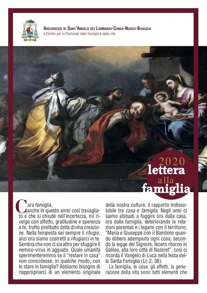 anche in questo anno così travagliato e che si chiude nell’incertezza, mi rivolgo con affetto, gratitudine e speranza a te, frutto prelibato della divina creazione. Nella tempesta sei sempre il rifugio, anzi ora siamo costretti a rifugiarci in te. Sembra che non ci sia altro per sfuggire il nemico-virus in agguato. Quale umanità sperimenteremmo se il “restare in casa” non coincidesse, in qualche modo, con lo stare in famiglia? Abbiamo bisogno di riappropriarci di un elemento originale della nostra cultura: il rapporto indissolubile tra casa e famiglia. Negli anni ci siamo abituati a fuggire ora dalla casa, ora dalla famiglia, deteriorando le relazioni parentali e i legami con il territorio: “Maria e Giuseppe con il Bambino quando ebbero adempiuto ogni cosa, secondo la legge del Signore, fecero ritorno in Galilea, alla loro città di Nazaret”, così ci ricorda il Vangelo di Luca nella festa della Santa Famiglia (Lc 2, 38). La famiglia, la casa, gli affetti, la generazione della vita sono tutti elementi che trasformano la “chiusura domestica” nella possibilità di ritrovarsi, in qualche modo, come luogo e segno dell’alleanza di Dio con il suo popolo.