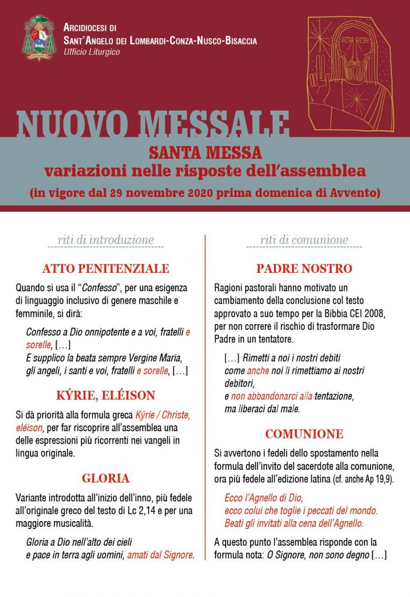 Infatti, a partire dalla prima domenica di Avvento (29 novembre 2020), la nostra diocesi, come la maggior parte delle Chiese italiane, inizierà ad usare il Nuovo Messale. Per quanto possibile e con gli strumenti idonei, si istruisca la comunità non solo sulle variazioni rituali, ma sul significato e sugli orizzonti, che si aprono per la spiritualità liturgica e per la vita cristiana. In particolare ricordo che le due mutazioni all’interno della preghiera del Padre nostro sono da osservare sempre, sia nella Celebrazione Eucaristica sia in ogni altro momento di preghiera comunitaria e personale. Le restrizioni del tempo presente ci consentono di celebrare l’Eucaristia con il nostro popolo, è un grande dono da valorizzare, da vivere in pienezza e da conservare anche con comportamenti esemplari nelle difficoltà della pandemia.