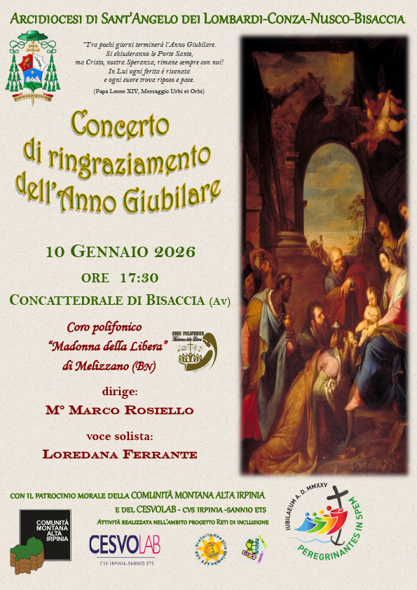 in Evidenza 3 Gennaio 2026 Concerto di ringraziamento dell’Anno Giubilare 10 gennaio 2026_ore 17.30_Concattedrale di Bisaccia Concerto di ringraziamento dell’Anno Giubilare 10 gennaio 2026_ore 17.30_Concattedrale di Bisaccia Coro polifonico “Madonna della Libera” di Melizzano (BN) dirige: M° MARCO ROSIELLO voce solista: LOREDANA FERRANTE condividi su Locandina Concerto 10 gennaio