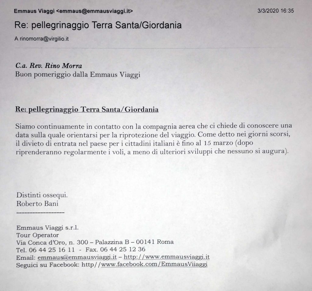 Oggetto: Rinvio del pellegrinaggio in Terra Santa/Giordania 17-25 marzo 2020 a data da destinarsi entro l’anno 2020.